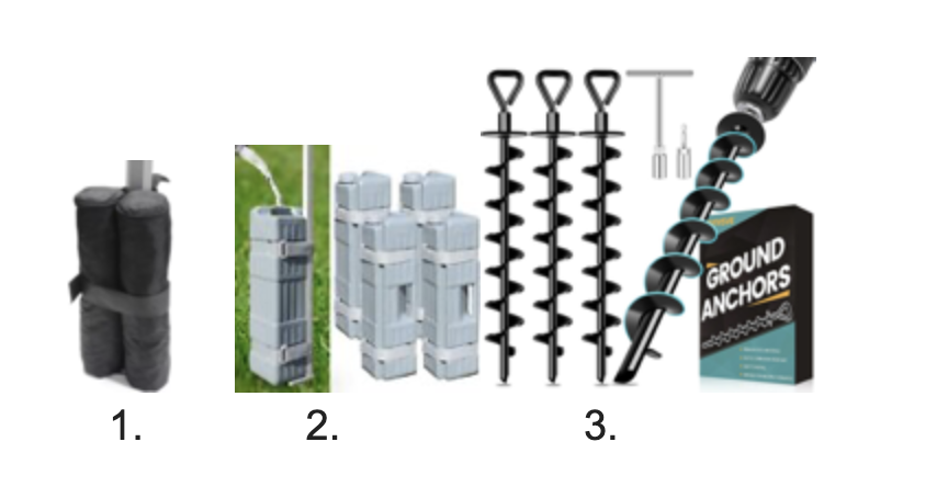 Weights for your tent are a must! We almost lost a few tents last season due to the wind. There’s nothing more dangerous than a flying tent in a crowd of people. You cannot set up your tent without weights! The thin metal stakes and the disks don’t work. Your weights should be no less than 30 lbs. each. Keep reading for suggestions.