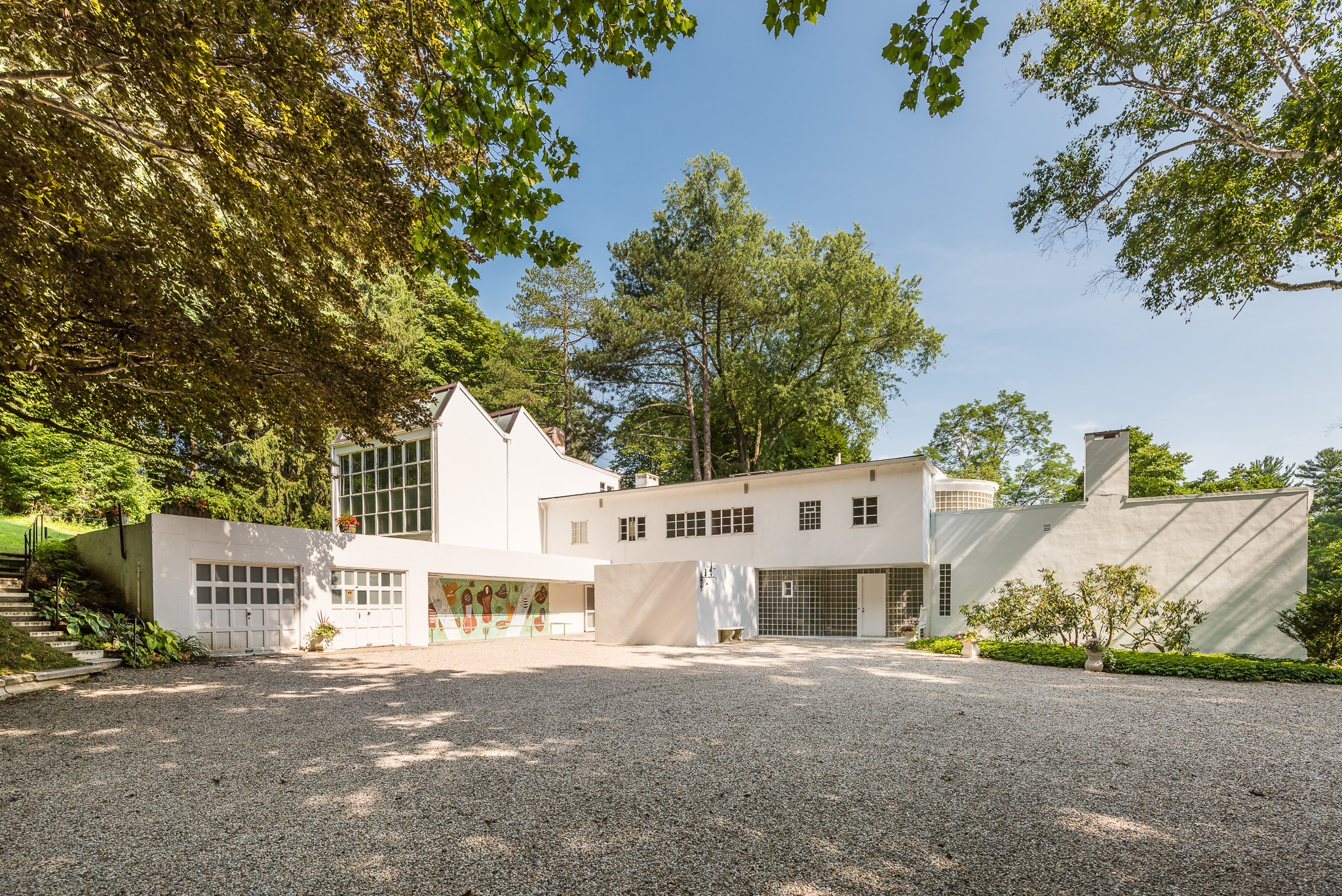 Set startlingly amid Gilded Age cottages is an unusual and very modern sight: Frelinghuysen Morris House & Studio. This white stucco and glass block assemblage of geometric volumes is tucked into a 46-acre estate abutting Tanglewood. Artist, art critic, and collector George L.K. Morris built the Studio in 1931 in the shadow of Brookhurst, his parents’ 1908 estate. The Studio was meant to recreate the architect Le Corbusier’s studio in Paris where Morris had studied. It was considered the first modern structure in New England. In 1941, after marrying Suzy Frelinghuysen, a fellow artist and opera singer, they added to the house, inspired by the International Style of architecture. Due to COVID-19, the House & Studio is only open to the public through September 5, 2021. In normal they are open from late June until Columbus Day. Visitors come to the House & Studio to view the couple’s collection of Cubist Masters, including Picasso, Braque, Gris, and Leger, as well as frescoes and paintings by Morris and Frelinghuysen themselves. Furnishings by Modern masters such as Gilbert Rohde, Paul Frankl, and Donald Deskey complete the harmony of art, architecture, and design. Professional artist demonstrations, art workshops, and lectures are offered as well, as are documentary and restored vintage films. Frelinghuysen Morris House & Studio is listed on the National Register of Historic Places.